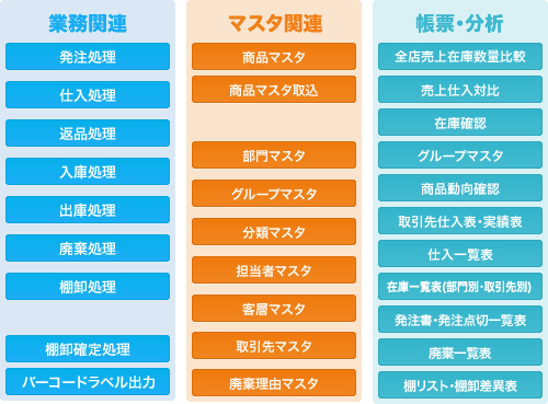 単品マスタの作成、配信、在庫管理(発注・仕入~棚卸)が行えます。